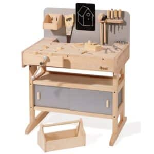 - Sicherheit: Die Werkbank sollte keine scharfen Kanten oder kleine, verschluckbare Teile enthalten. Zudem ist es wichtig, dass sie stabil steht und nicht kippen kann.